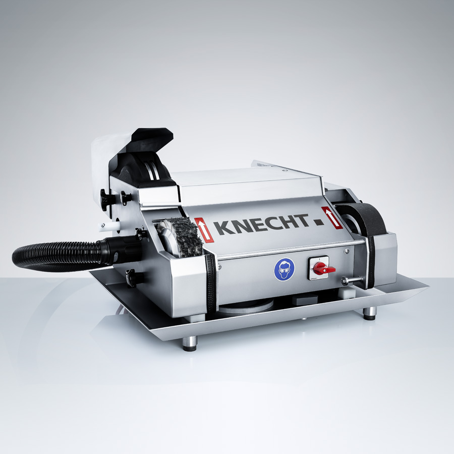 Established since many years, the Wet-Sharpening Machine is now available in a new version especially for sharpening hand knives. The knife guides ensure, that the hand knives are sharpened with the correct cutting edge angle at all times. Additional integrated magnets support the guidance of the knife and make the grinding process highly simple. The long-life CBN grinding wheels are water cooled. That prevents overheating of the knives. The grinding removal is bonded in the water and doesn't end up in the environment. The water cooled grinding belt makes the USK 160 S universal.