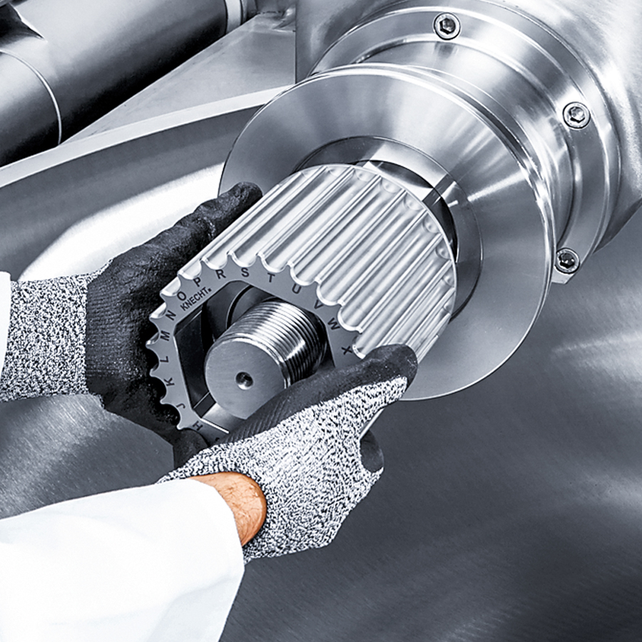 Instead of costly retaining rings of conventional knife systems, the KNECHT K 24 cutter knife system uses a combination of a toothed profile sleeve and simple intermediate rings. The top priority of the K 24 cutter knife system is simple handling and maximum operational safety. Therefore, no moving parts such as bolts or screws are used.