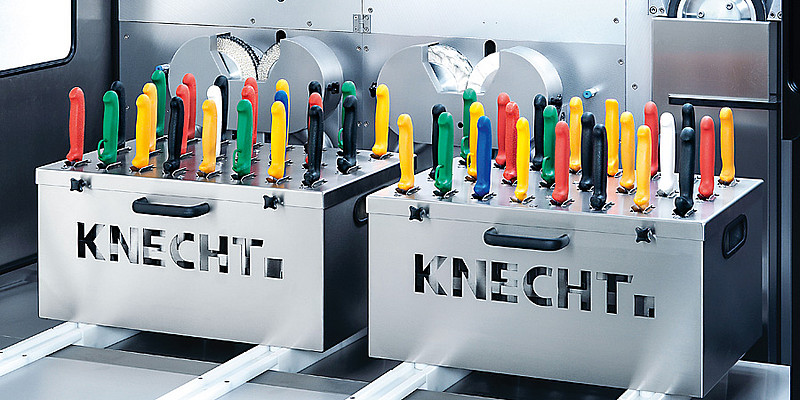 Высокий уровень инноваций, а также постоянное стремление к совершенствованию являются ключевыми элементами нашей корпоративной философии. Для того чтобы еще больше оптимизировать качество заточки ручных ножей, мы внедрили в станок E 50 новейшие достижения техники. Станок затачивает ручные ножи различной формы и размеров в автоматическом режиме. Захват с управлением по 4 осям извлекает нож за ручку из накопителя – форма ножа определяется индивидуально – нож затачивается точно по форме, зачищается и полируется, захват возвращает заточенный нож в накопитель ножей.