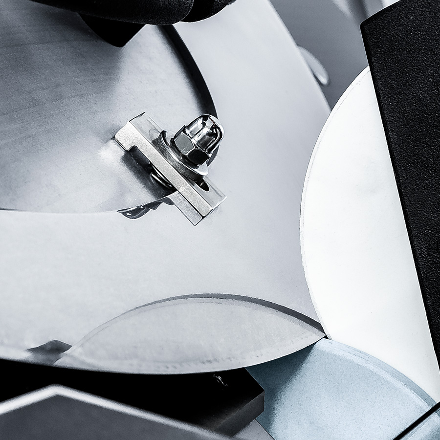 Для заточки серповидные ножи направляют вручную по определенной траектории вдоль шлифовальных кругов. Эта траектория задается копировально-шлифовальной плитой и соответствует контуру ножа. Таким образом, сохраняется первоначальная форма ножа.