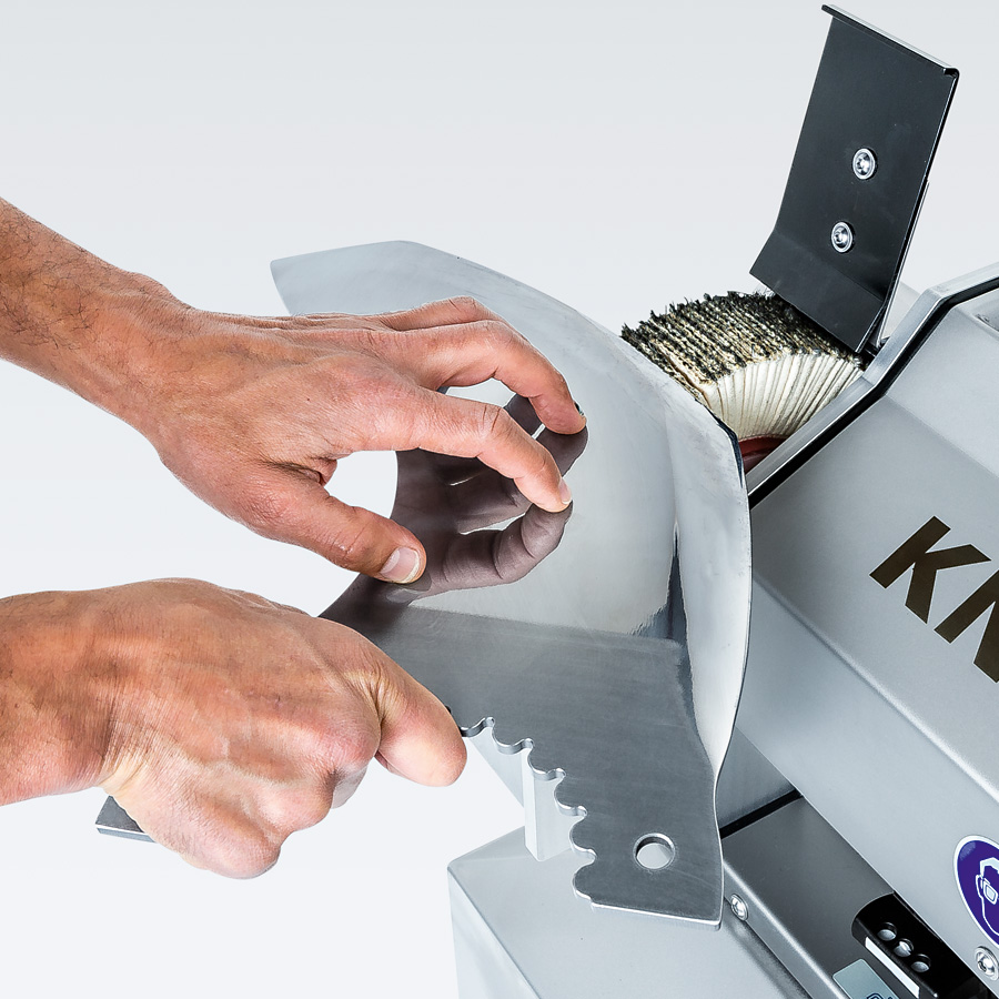 Удаление заусенцев и полирование ножа выполняются на пластинчатой щетке. Оптимально подобранные скорость вращения и упругость щетки минимизируют возможные ошибки оператора при работе.